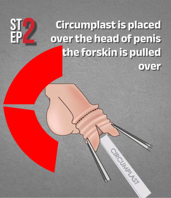 - Place the Circumplast device until it reaches the coronal sulcus. Secure the foreskin to the distal edge of the Circumplast® device using forceps.